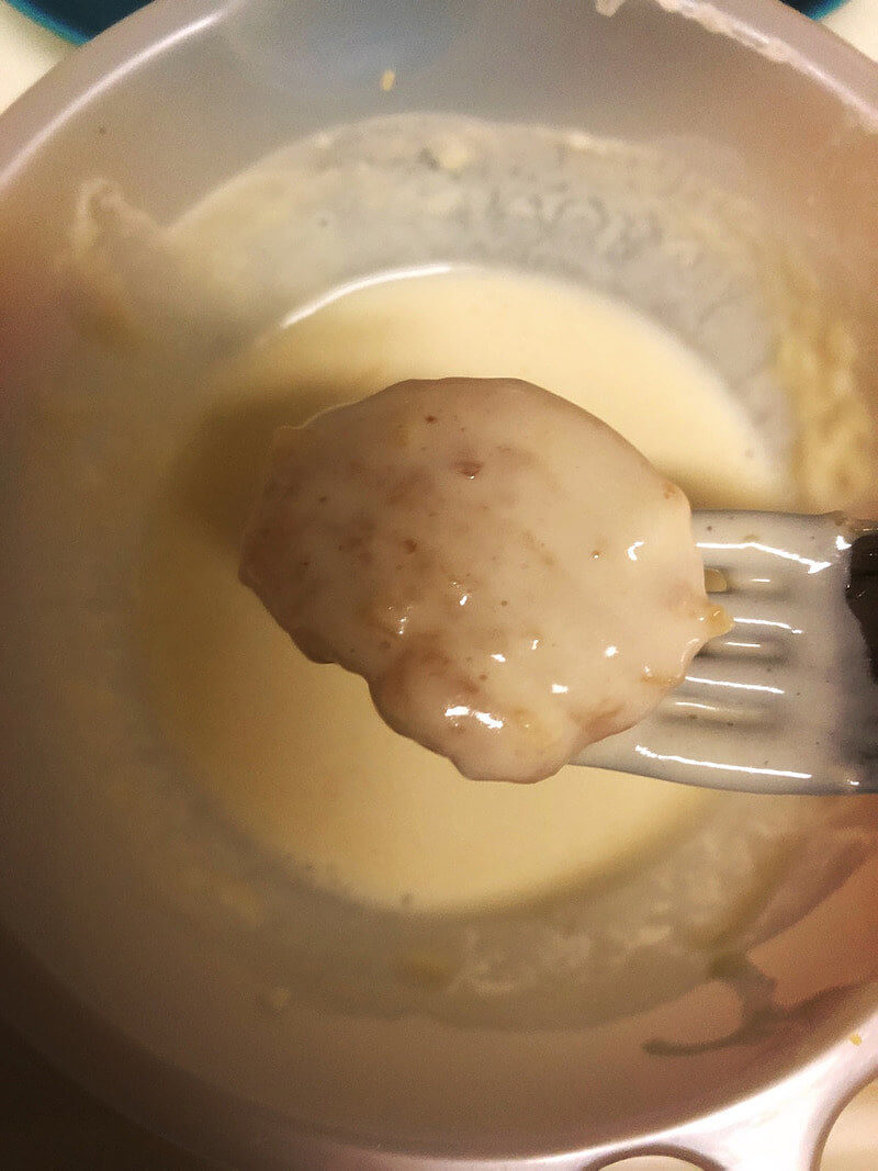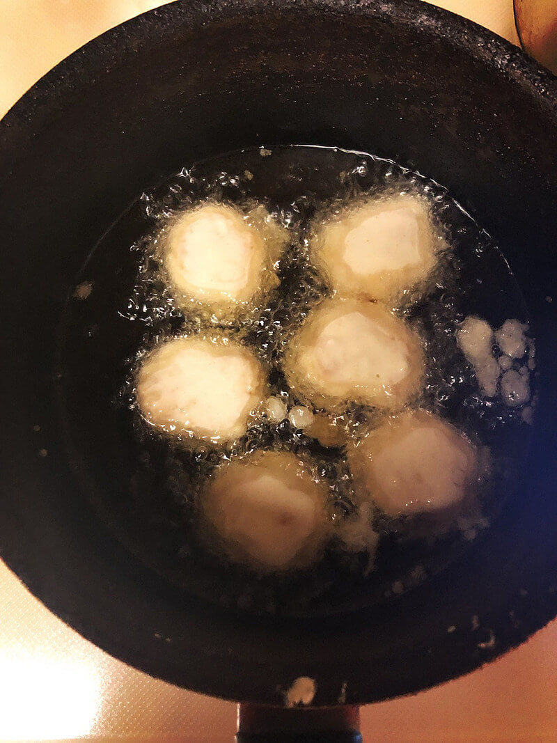 5、4に衣を付けて、180度の油できつね色になるまで揚げていきます。