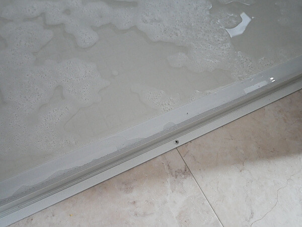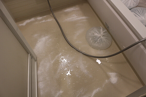 浴室から洗面所に戻れなくなるので、洗面所から浴室に向かってお湯を流し込みましょう。