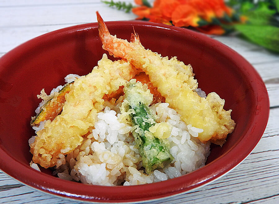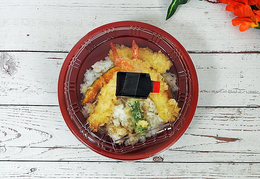 夢庵のお持ち帰りメニューでもお得な価格なのが「ランチ天丼(平日ランチ限定)」454円(税別)。平日の店舗オープン時間から16時まで注文を受け付けていますので、早めの夕食用としてもいいかもしれません。店舗によって時間は異なる場合があります(※5)。