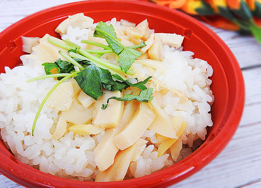 3つの容器にわかれていて、とっても豪華に見えますね。お弁当の内容は季節によって異なるようですね。私は2020年5月に夢庵の行楽弁当を購入しましたので、春先の旬の食材・たけのこがのったごはん。季節によってはきのこ系のごはんになったりするみたいですね。