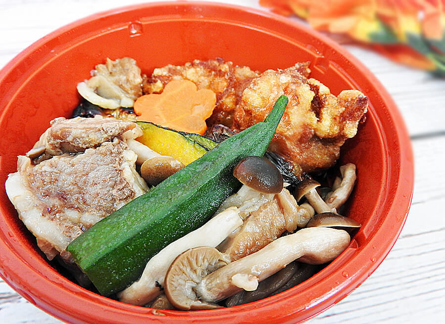 3つ目の容器には、すき焼き風に味付けされたお肉や野菜・から揚げ・焼き魚が入っていましたよ。