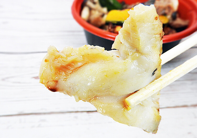 行楽弁当の味付けは、想像よりも薄め。「薄め」ですが、物足りなさを感じる味ではありません。素材の味を活かしつつ、だしや醤油ベースの味付けがついていますよ。外食チェーン店のお弁当としては、薄味に仕上がっていると思います。