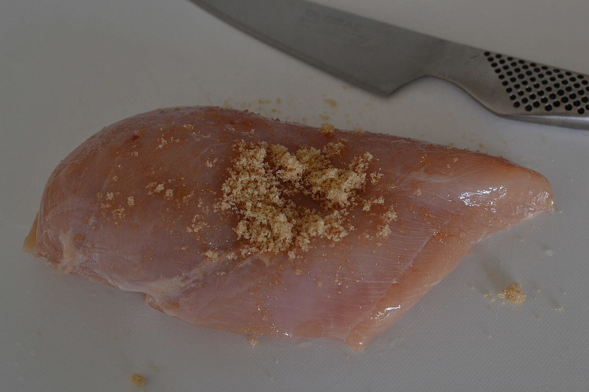 (1)鶏むね肉の皮と余分な脂肪を取り、砂糖→塩の順でまぶす(今回は三温糖を使用)