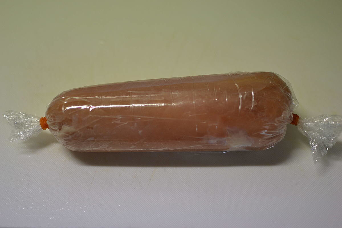 (3)②の鶏肉の厚みを均一にしてラップで包み、キャンディのように両端をゴム等で止める