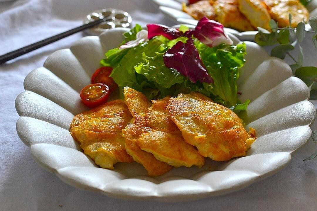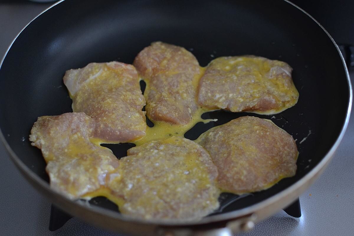(3)溶き卵に粉チーズを混ぜ、②をくぐらせる