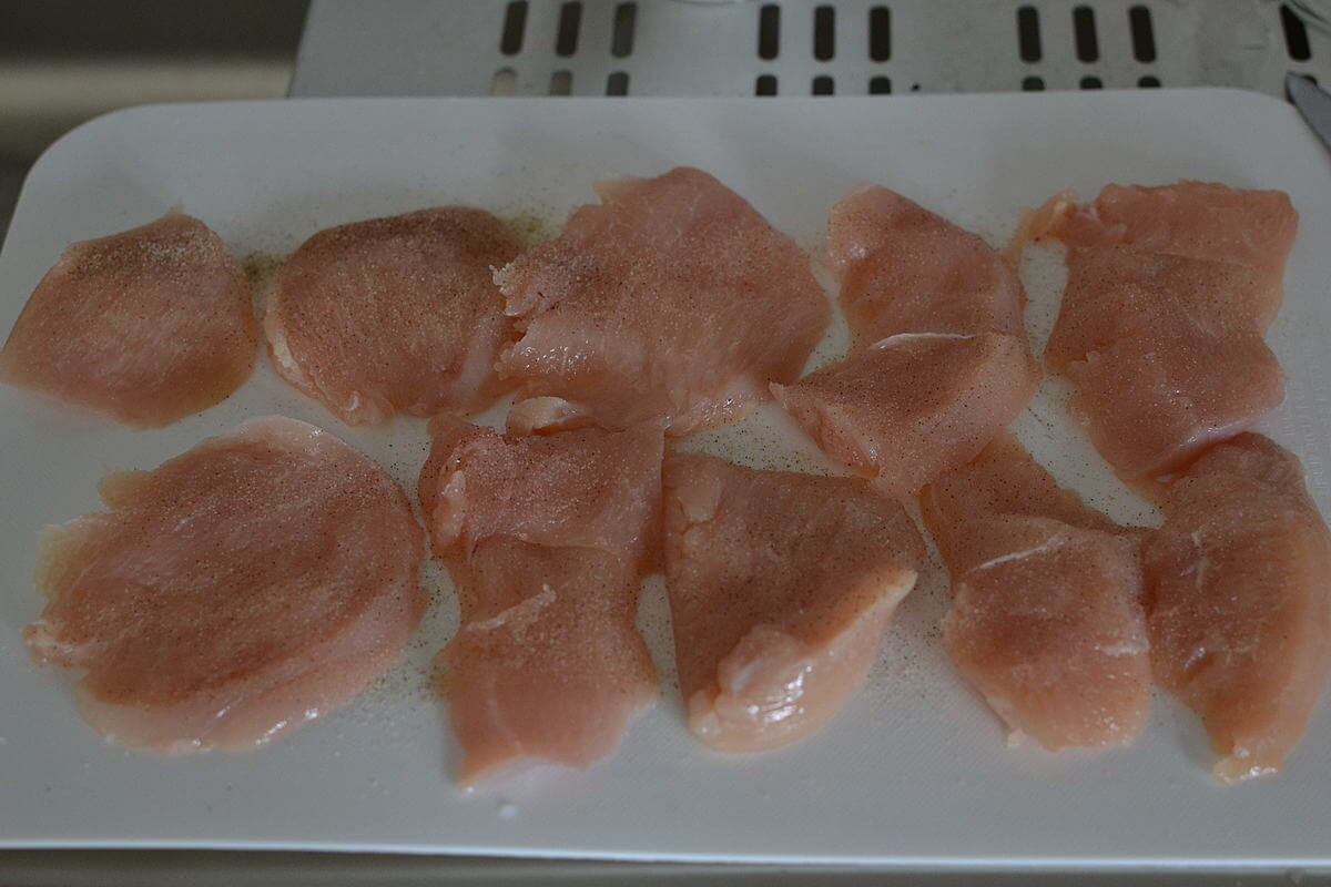 (1)鶏むね肉は皮をはいで1cm程度のそぎ切りにし、塩・こしょうを両面にふり下味をつける