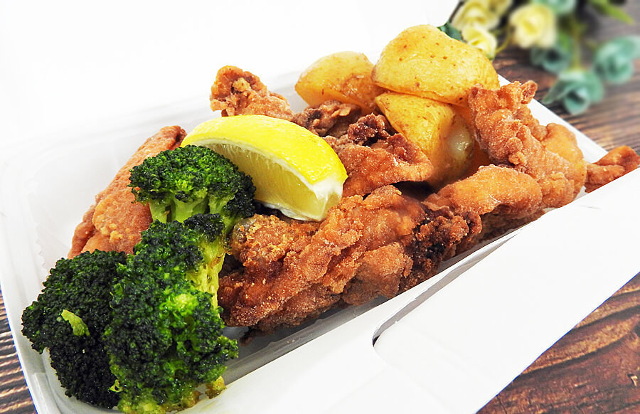 米粉の衣が特徴的な米粉竜田チキンが5ピースとじゃがいも、レモンが入っていますよ。