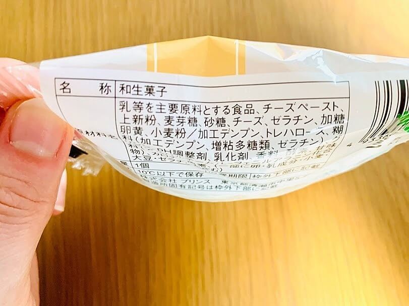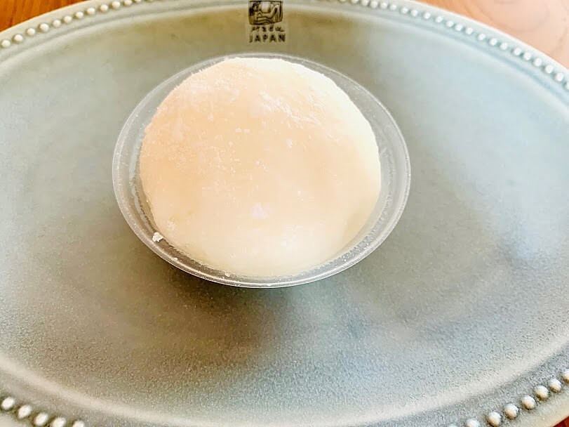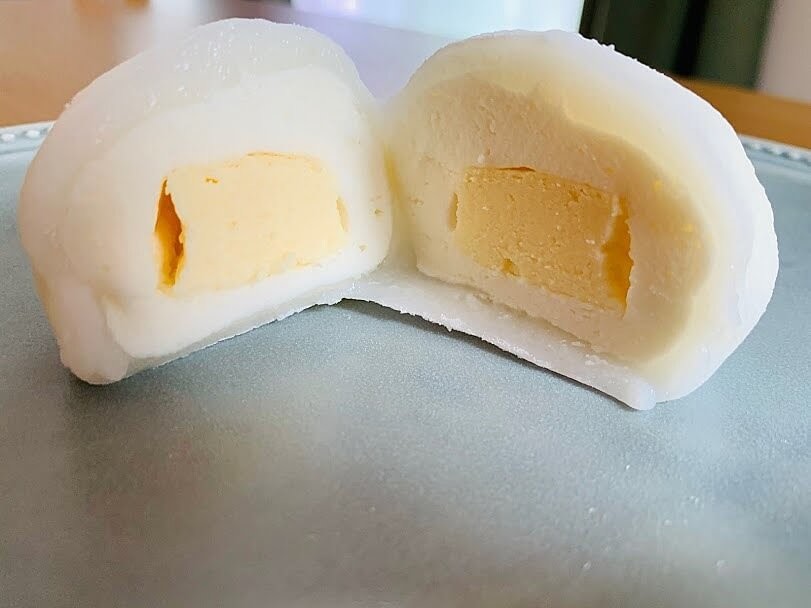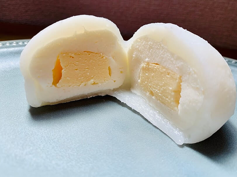 白っぽくて見えにくいですが、大福の下にはレアチーズ、中央に四角いベイクドチーズが入っています。