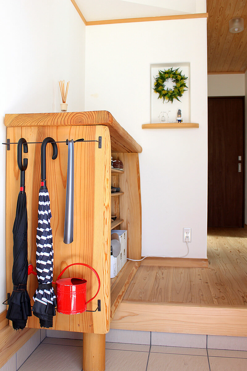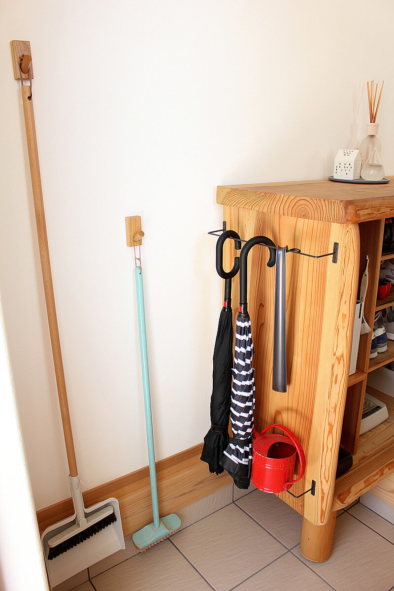傘は水がたまりやすい床置きの傘立てをやめて、シューズボックスにアイアンバーを設置して引っ掛けました。