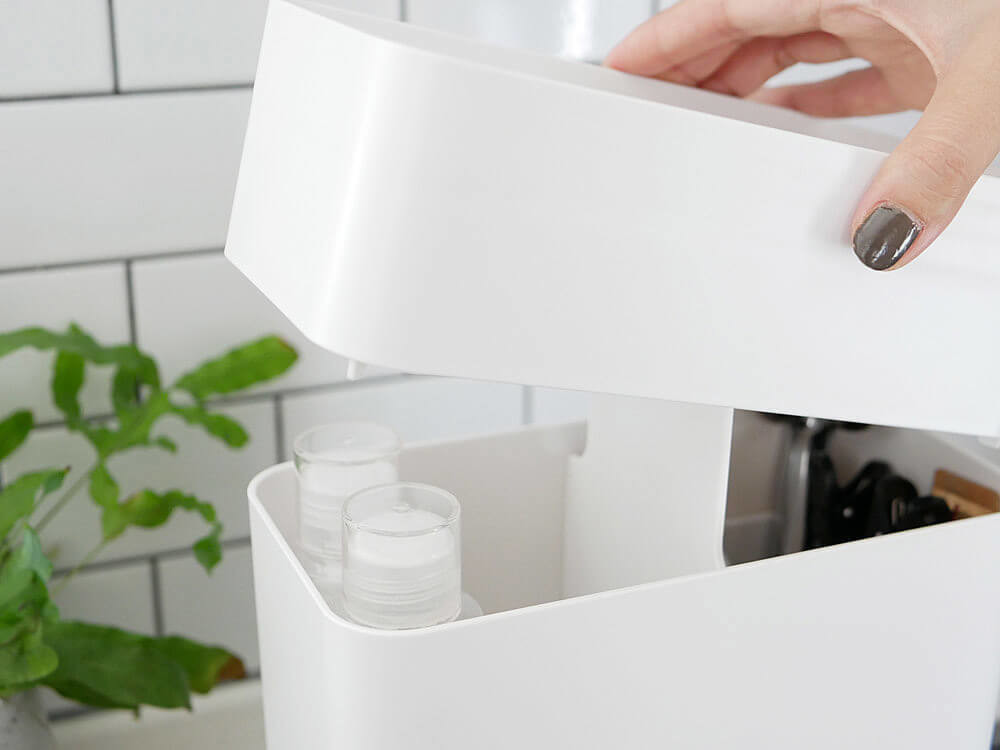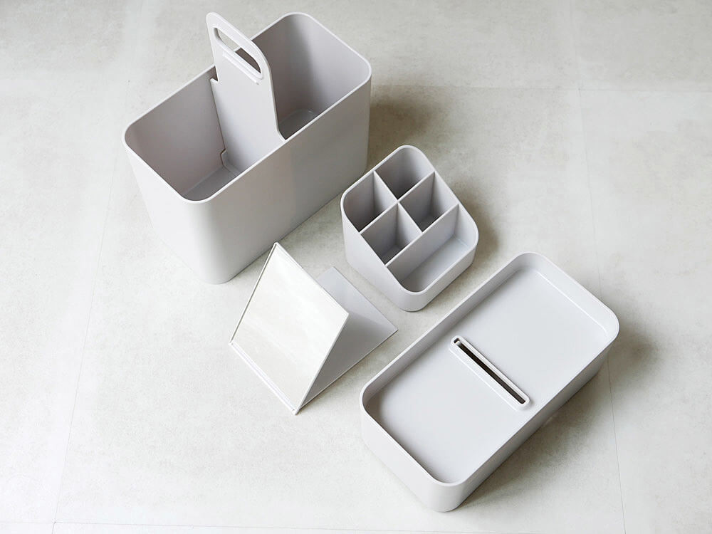 シンプルで使いやすいデザインと持ち運びしやすいハンドル付きで毎日のメイクタイムを快適にサポートします。カラーは清潔感のあるホワイトと明るく柔らかい印象のグレーの2色あります。