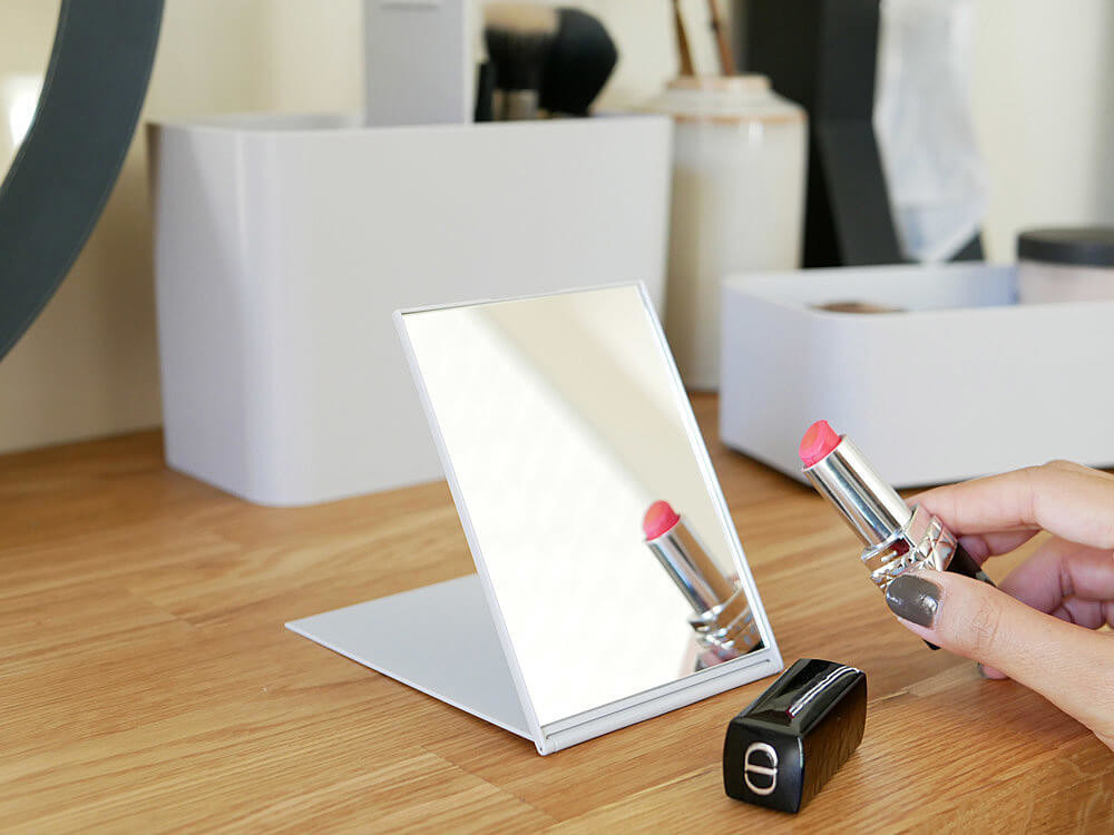 トレーの上にミラーを置いて高さ調節するのもおすすめの使い方。
