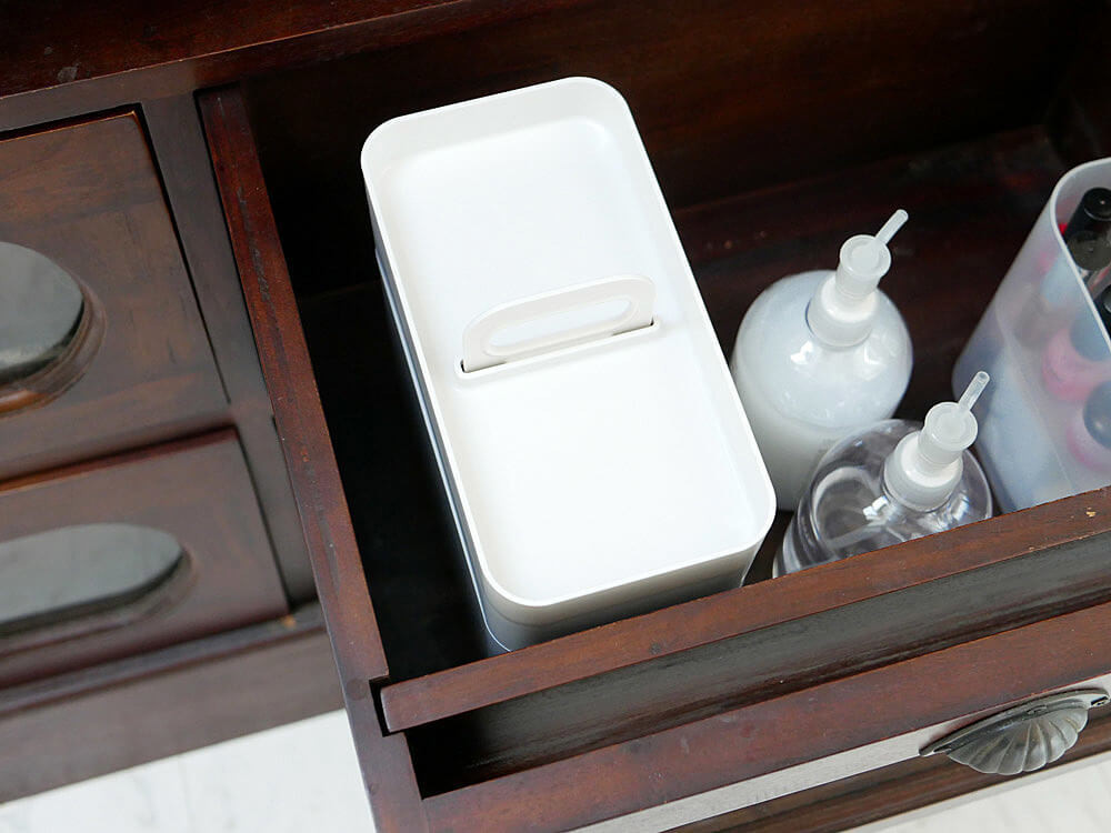 ボックスのサイズは、W210×D110×H230mmとスリム設計で棚や引き出しにスッキリ収まります。