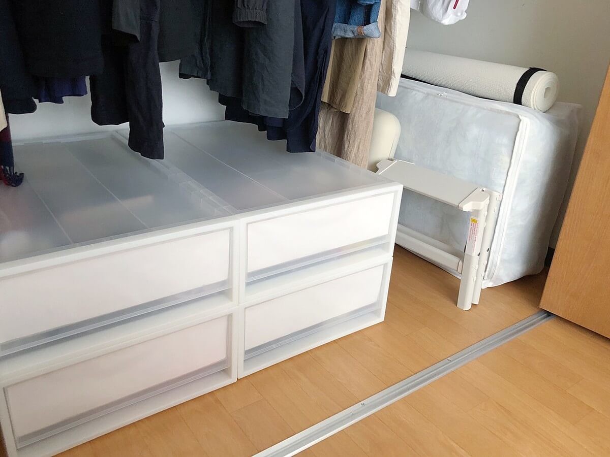 衣装ケースには部屋着や下着を収納。表側は白の画用紙で目隠ししています。 右端の白い大きなかたまりは、客用布団を圧縮して白のケースに収納したものです。 上に乗っているのはヨガマット。