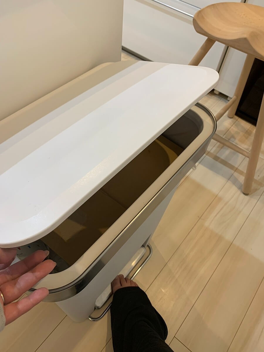 フタを取り外すのではなく、ふち部分をあげてカチッと止まった状態でゴミ袋の交換ができるので、ペダルを踏んでいなくてもいいので袋の交換、取り付けがしやすくなりました。