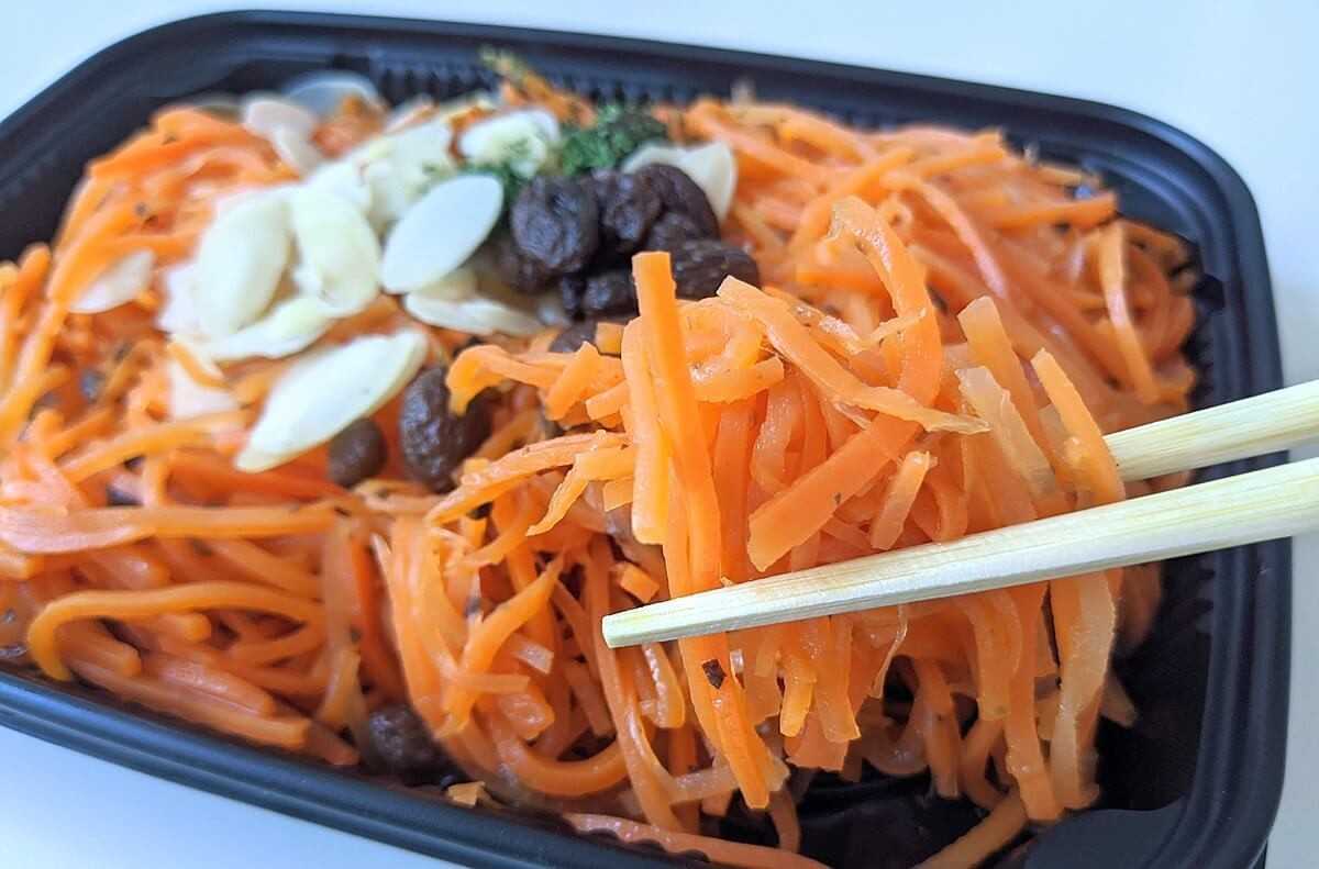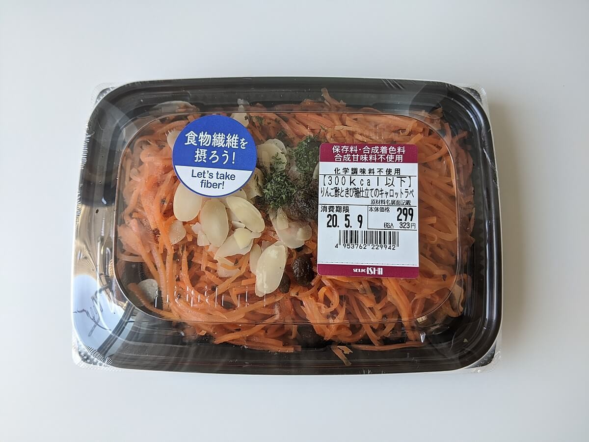 私がまず最初に選んだのは、リピーターが絶えないと評判の成城石井のキャロットラペです。 1パックに約1本分の人参を使用しているそうで、野菜不足が気になる方におすすめしたいヘルシーなお総菜です。