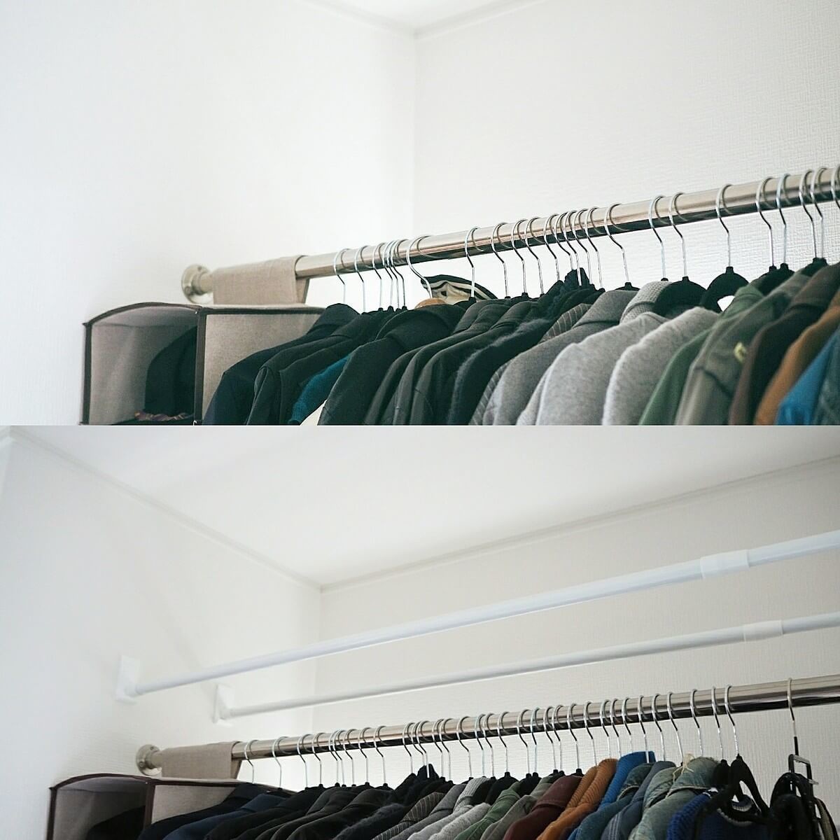 先ほど登場した突っ張り棒ですが、バーの後ろにも設置してみました。 冠婚葬祭用の洋服など使用頻度が低い洋服をこちらに移動したことで、ギューギューだったハンガースペースにその分ゆとりが生まれました。