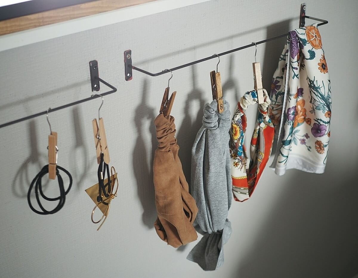 そこでまずは写真のようにバーを取り付けて、使用頻度の高いヘアアクセの収納場所を作りました。