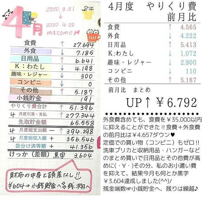 「費目ごとに予算を立てると、予算額すべて使ってしまうことに気づき、毎月のやりくり費は、食費、先取り貯蓄以外は、『給与から食費&先取り貯蓄を引いた額』とだけし、“貯蓄目標を達成できるようやりくりする”を意識しながら使うだけにしました」