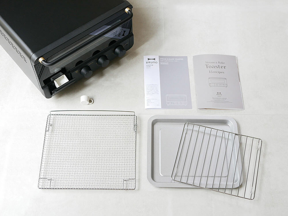 本体・焼き網・給水カップ・シリコンカップ・ベイキングトレイ・ベイキングトレイ用焼き網・保証書つき説明書(保証はお買い上げより1年間)・レシピブック