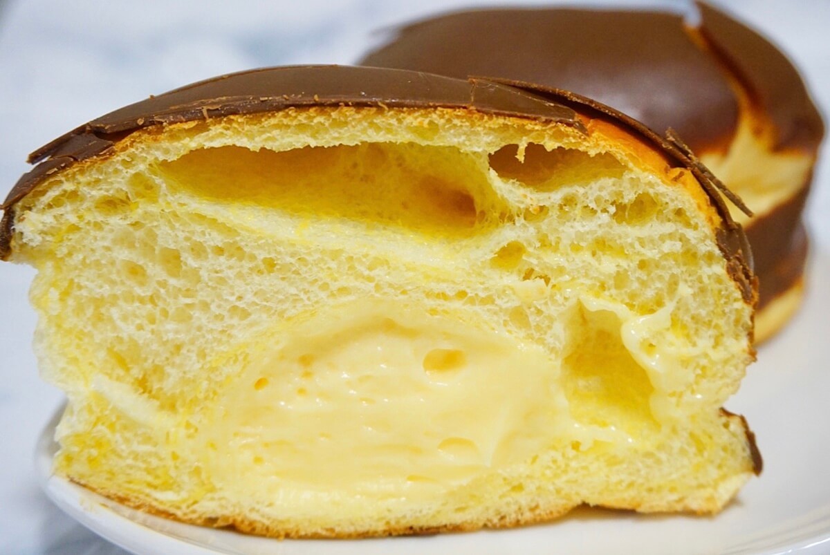 カスタードがふわふわで、噛むと横から飛び出しそうになるので要注意。