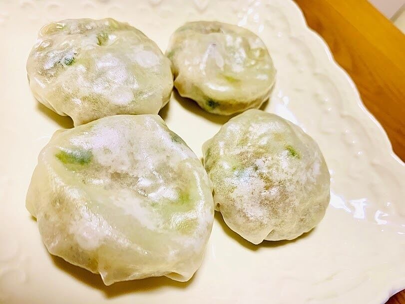 食べてみました。わ~ニラたっぷり!にんにくは入っていません。確かに皮がもちもち!水餃子の皮をもっと粉感アップして、モチっとさせたような感じです。