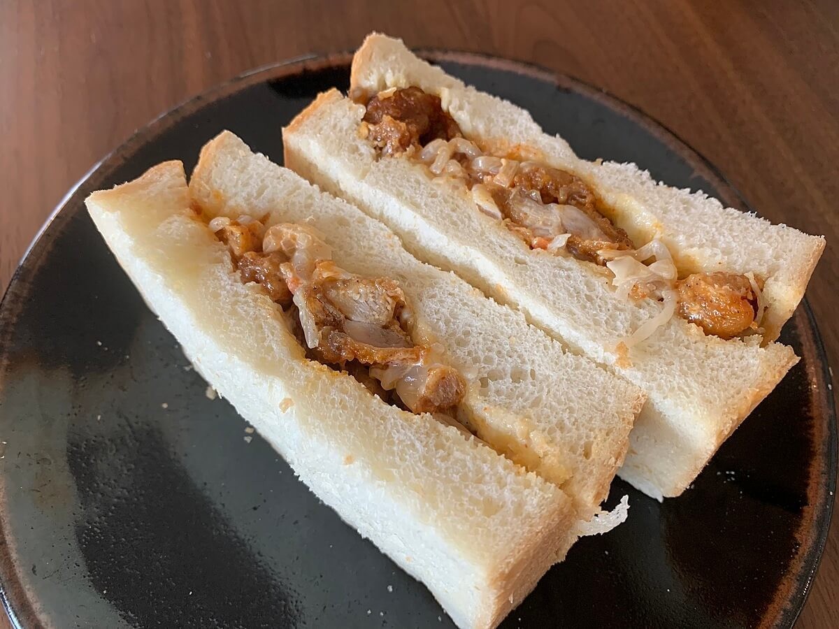 パンがあれば、ぜひサンドイッチに。マヨネーズを塗った食パンに挟んでみました。スパイシーなボリュームサンドの完成です。