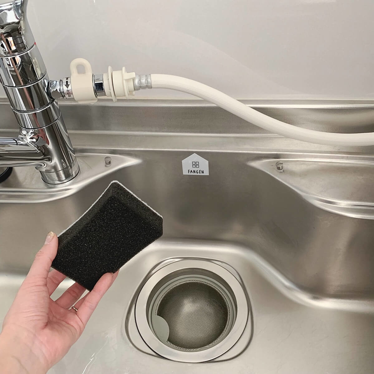 シンク用のスポンジはメラミンスポンジを小さく薄く切ったモノを用意して、1日ごとに使い捨てにしています。