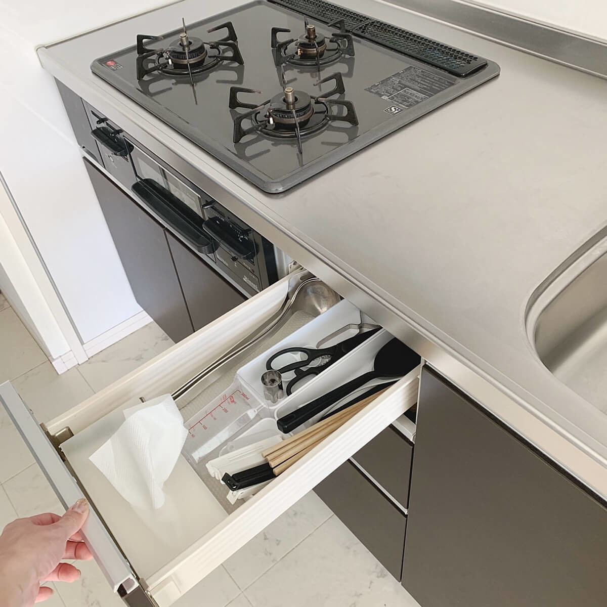 今では一番使いやすいキッチン中央の引き出しに一軍で使う道具のみを収納しています。ここならば埃や油はねも気になりません。
