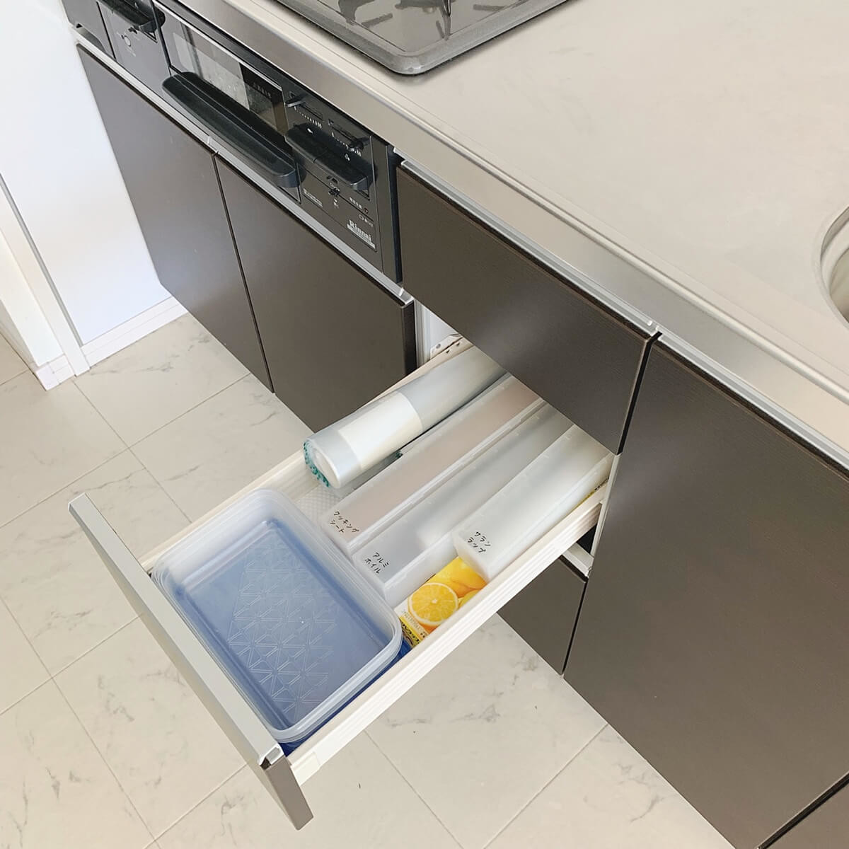 引き出しの2段目にはラップやホイル、保存容器などを収納しています。