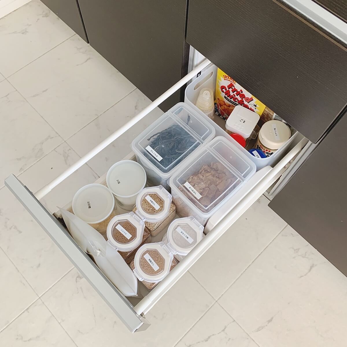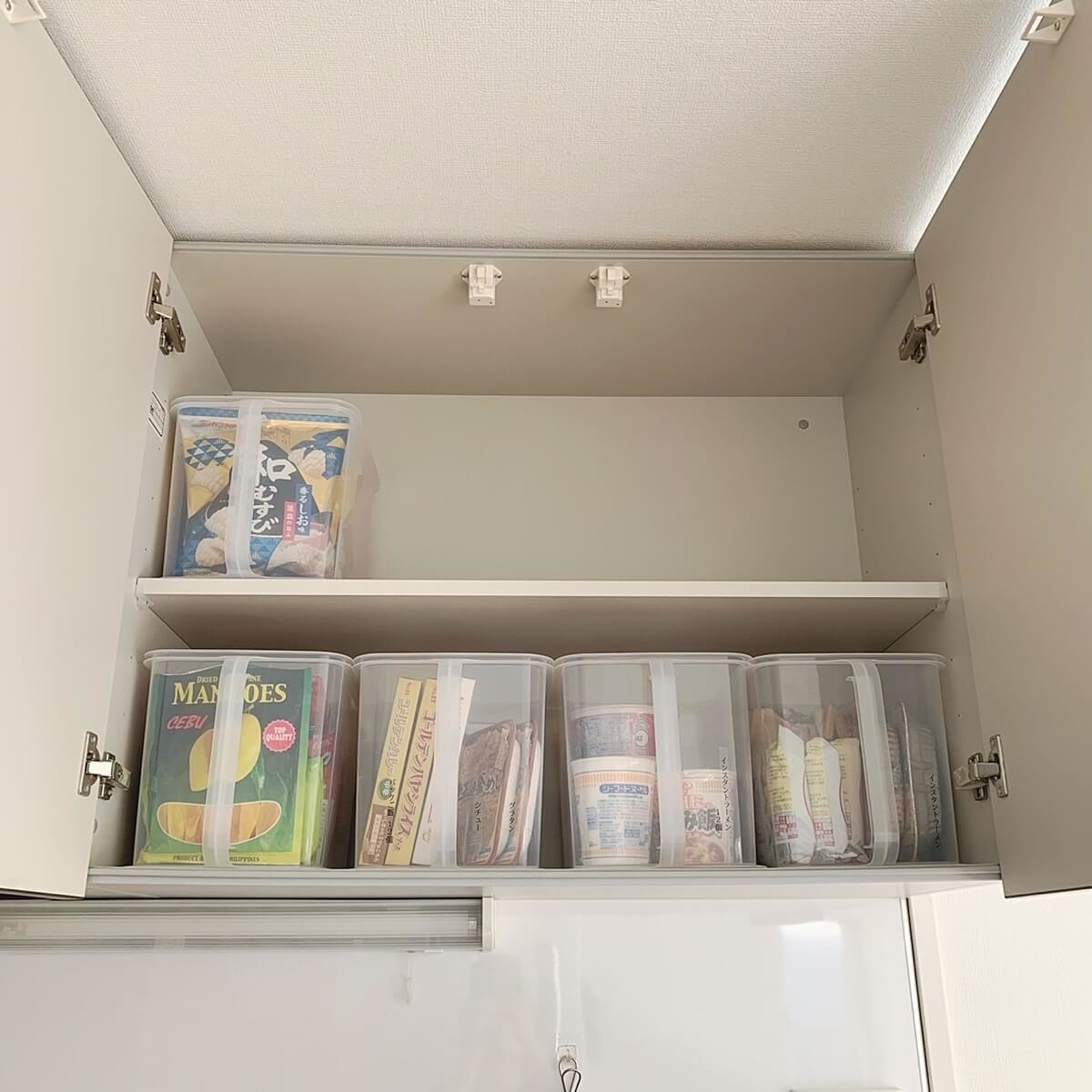 上段の収納には取手付きケースを入れ、食品ストックをグループごとに取り出しやすくしています。