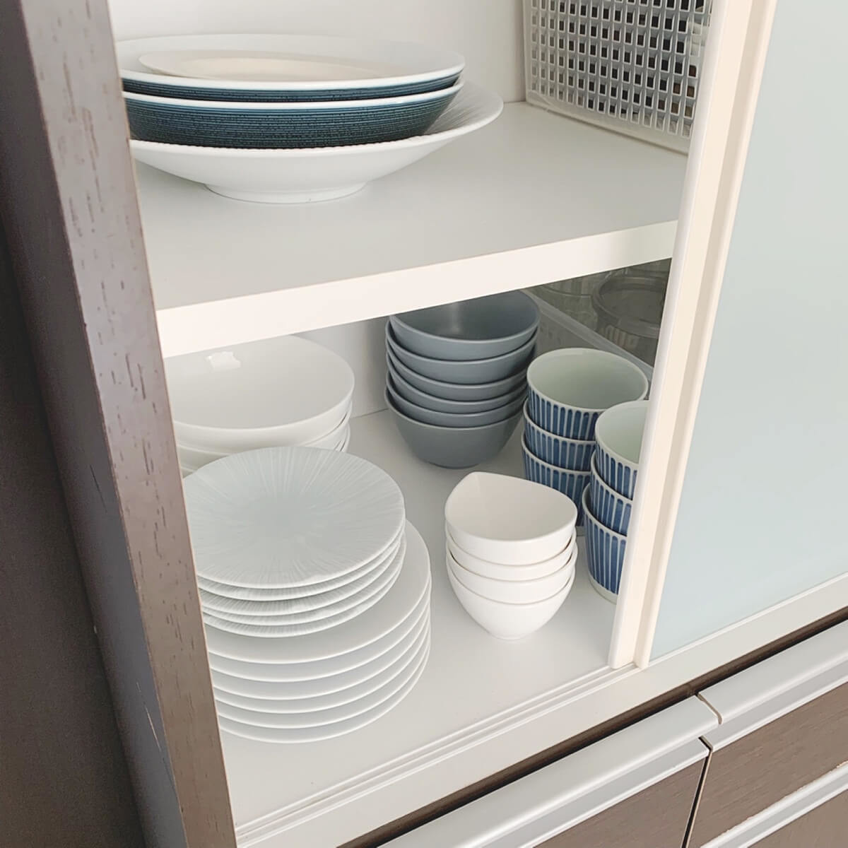 食器棚の中は、基本的にスタッキング可能な食器類ばかりにして、省スペースでたくさんの枚数を収納しています。
