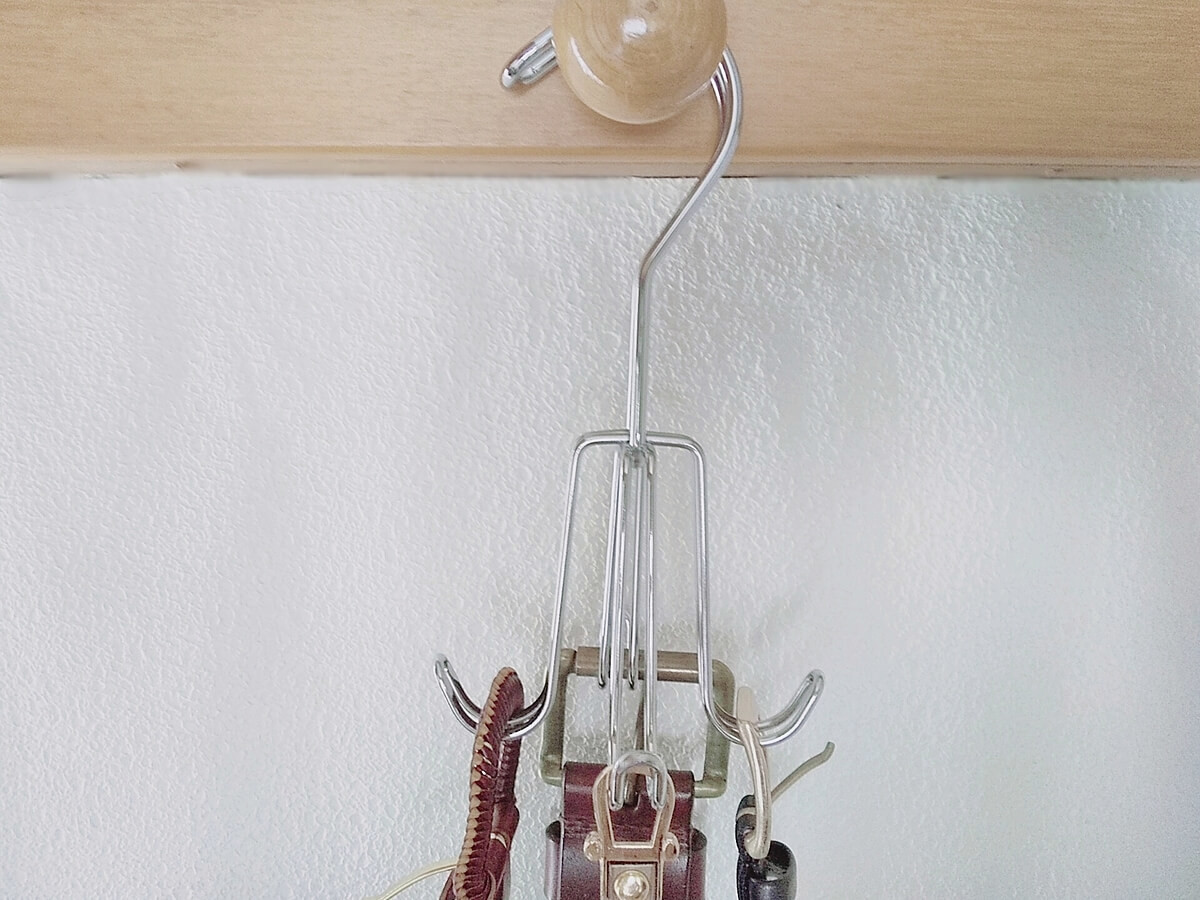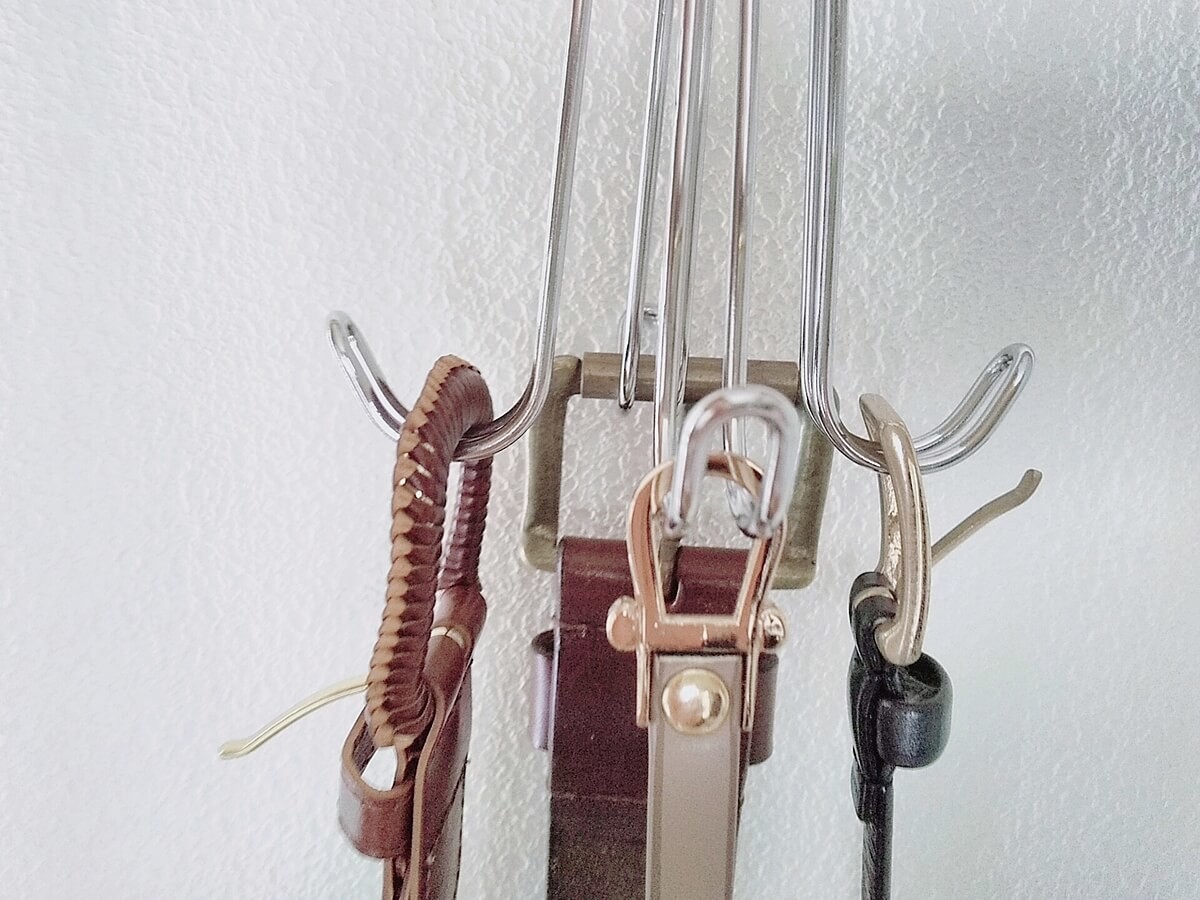 ひとつのフックに重ねて引っかけることもできますが、取り出しにくくなるので個人的にはおすすめしません。試してみましたが、下側になったベルトを取り出すのにイライラしちゃいました。