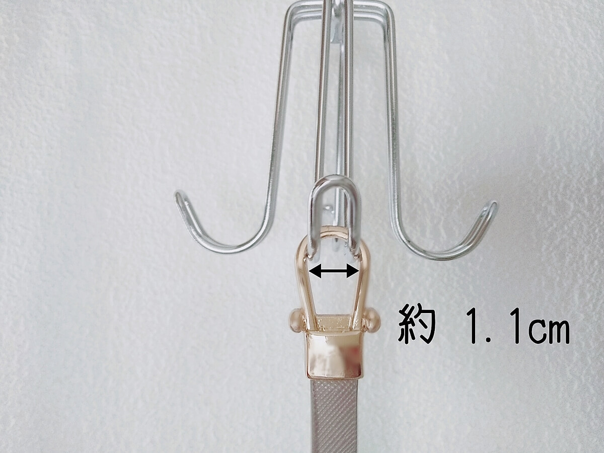 フックの幅は、約1.1cm。この幅よりもバックルの隙間が狭い場合は引っかけられません。