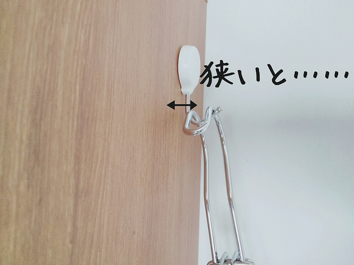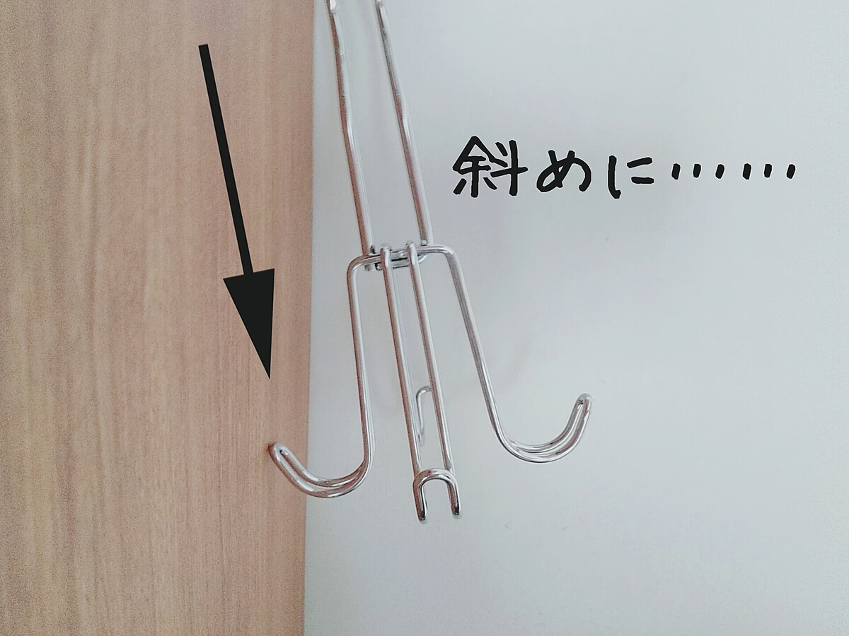 フックが棚に当たってしまいます。真っ直ぐにならず、斜めの状態になっていますよね。