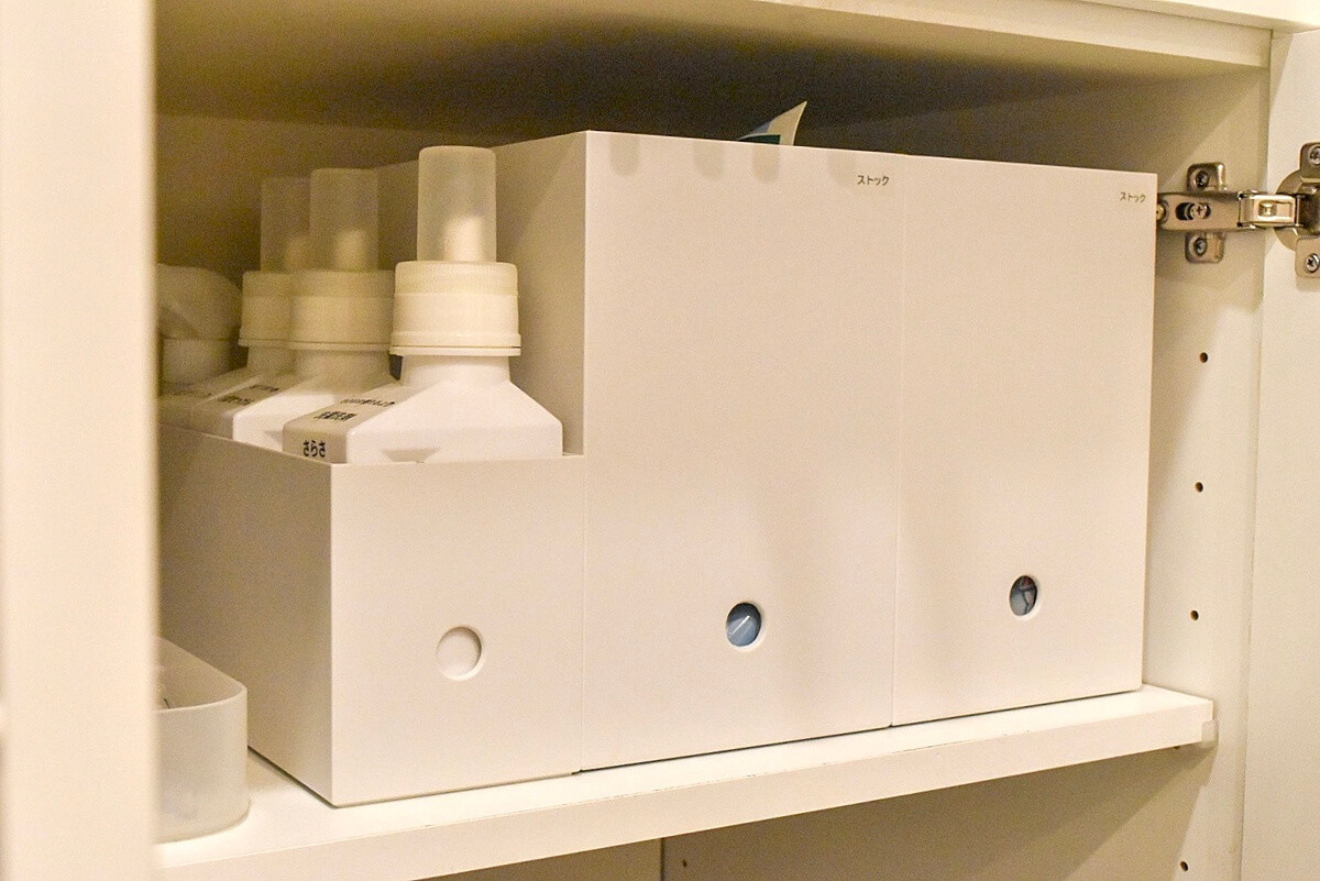 手前に使用頻度の高いものを収納し、奥にはストックや使用頻度の低いものを収納すると、使い勝手が良くなりますよ。