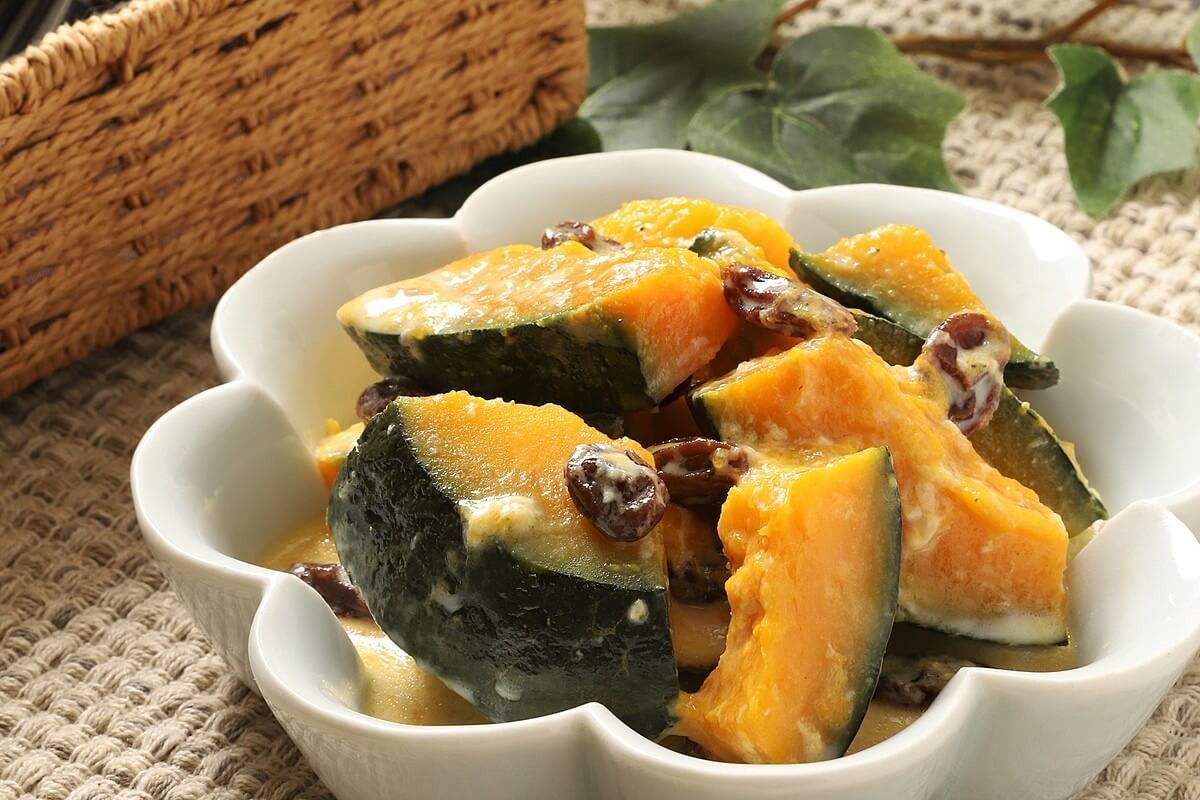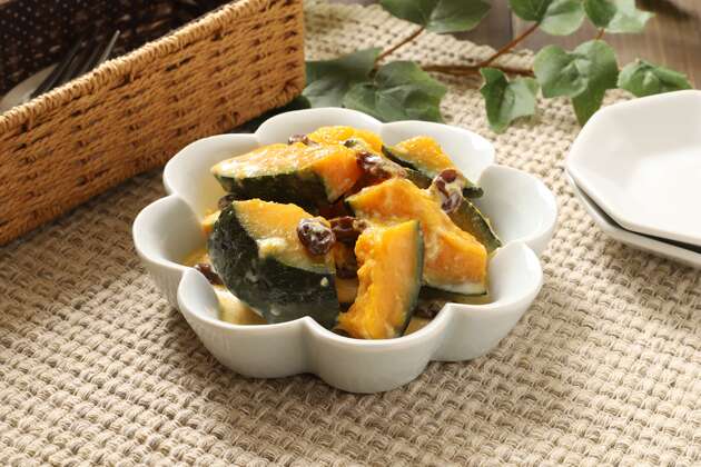 鍋にかぼちゃ、牛乳、コンソメ、バターを加えひと煮立ちしたら、落し蓋をして弱火で5分程焦げないように煮込み、かぼちゃが柔らかくなったら最後に干しぶどうを加えてできあがり。
