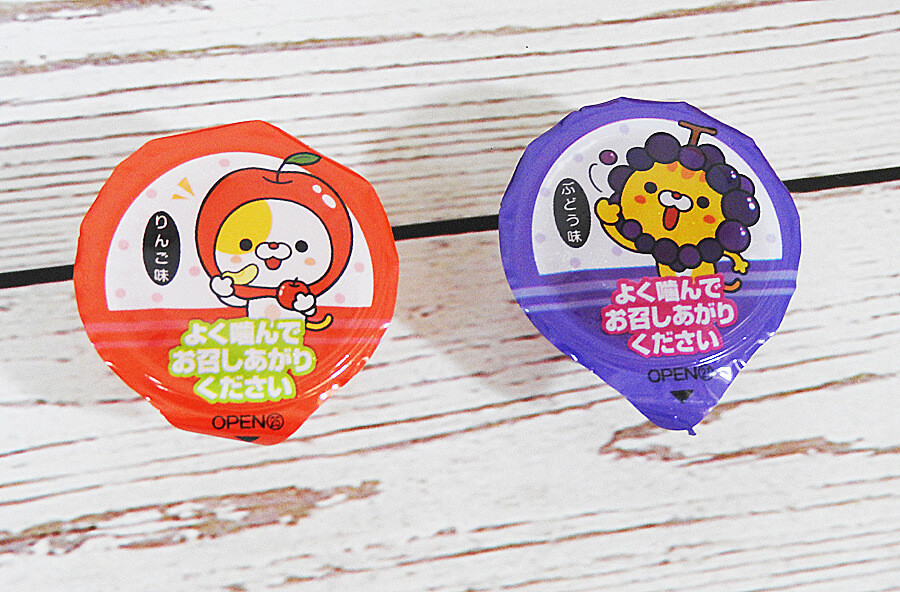 一口サイズのゼリー(りんご味・ぶどう味)もついていましたよ。写真撮り忘れてしまいましたが、野菜ふりかけもついていました。