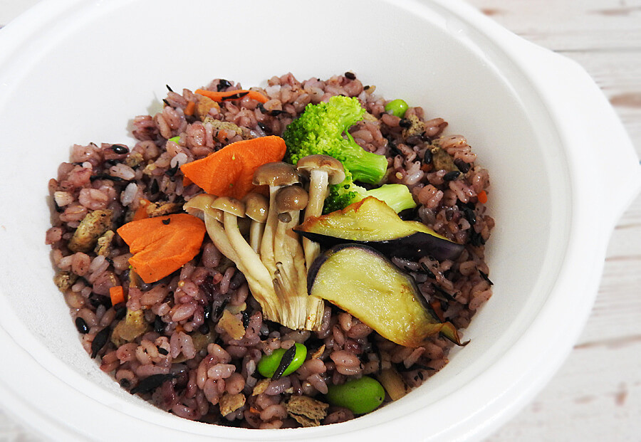 十六穀米には、ひじきや枝豆、油揚げが混ざっています。もちもちっとしていて、そのまま食べても美味しいですね。十六穀米の上にはブロッコリーやぶなしめじ、なす、にんじんがのっていました。食物繊維だけでなく、野菜もたっぷりなので、ヘルシーな感じがします。