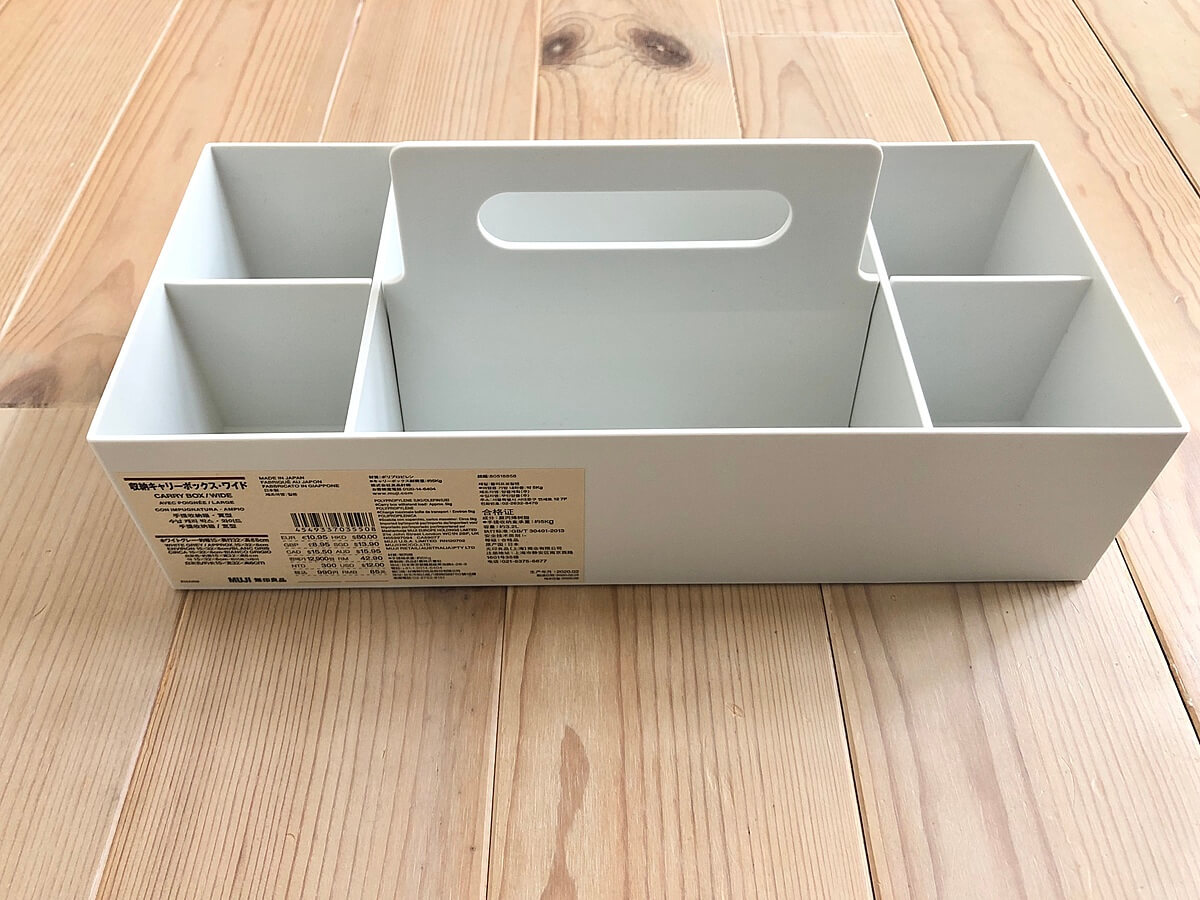 無印良品の「ポリプロピレン収納キャリーボックス・ワイド」がとっても便利! 整理整頓しやすい仕切りが付いたケースなので、文房具や工具の収納におすすめです。