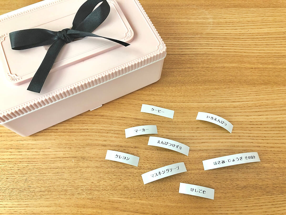 キャリーボックスに入れた紙コップに、アイテム名をラベリングしてお絵描きセットの完成です。