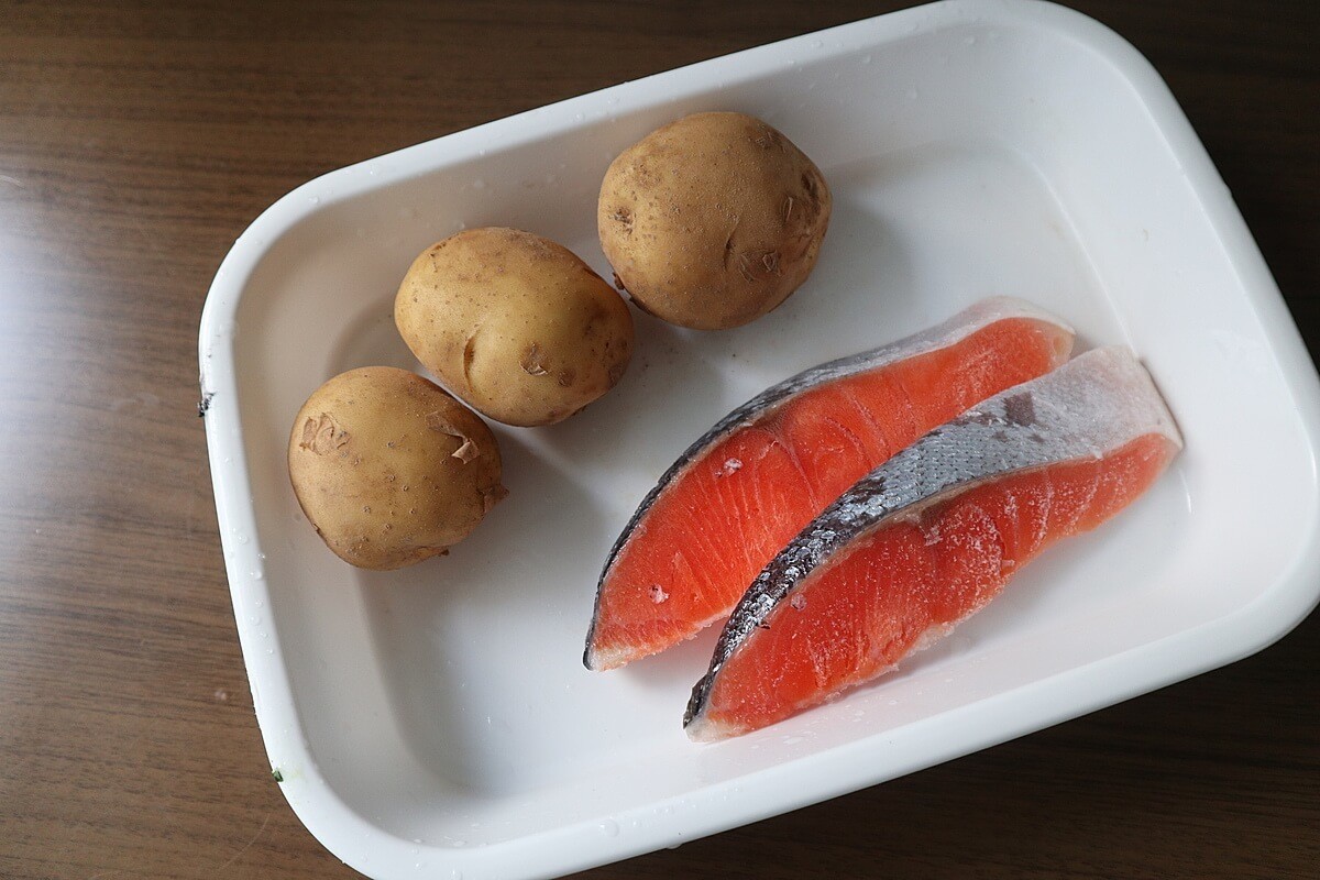 塩鮭 2切れ(骨をとって5等分にする) じゃがいも 3個(幅1cmの輪切り)