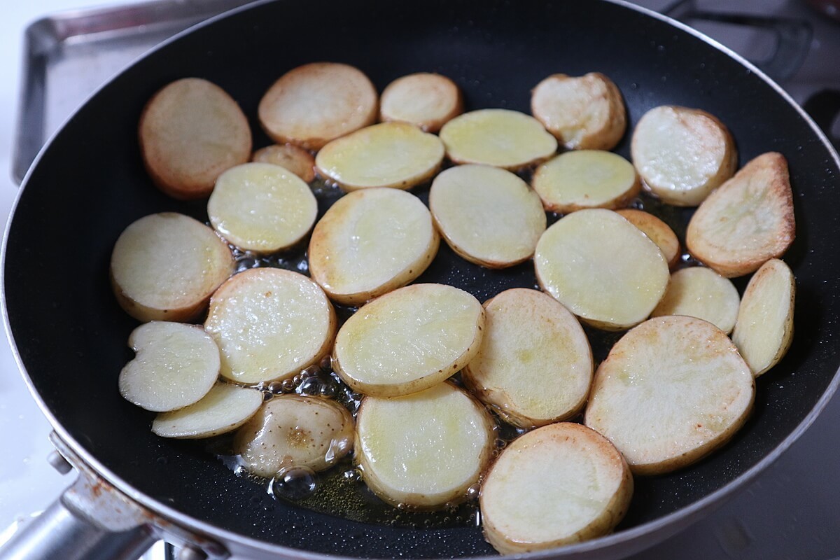 1、フライパンを中火にかけてオリーブオイルを敷き、じゃがいもを両面こんがり焼く。火が通ったら一度取り出す。