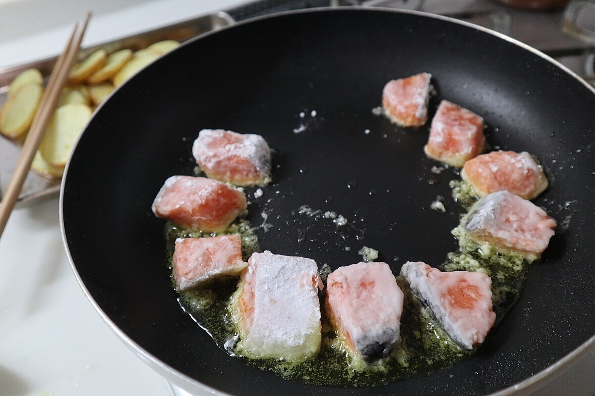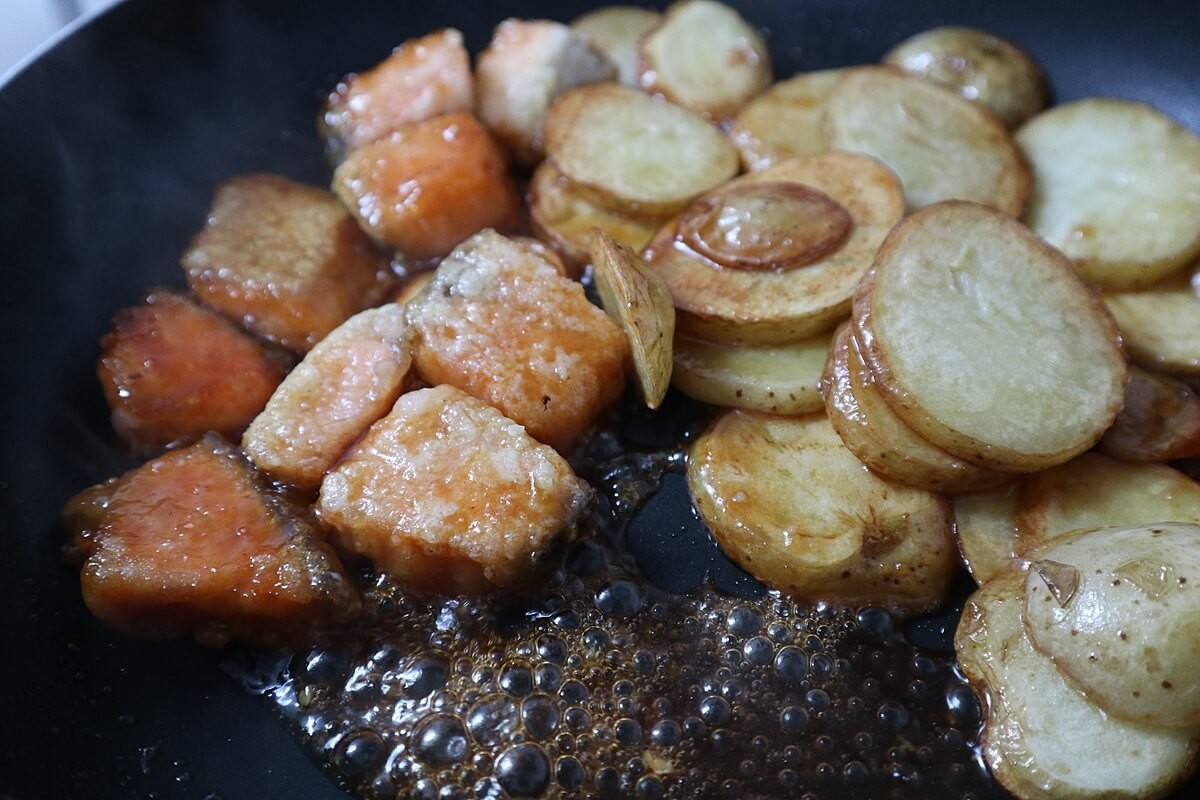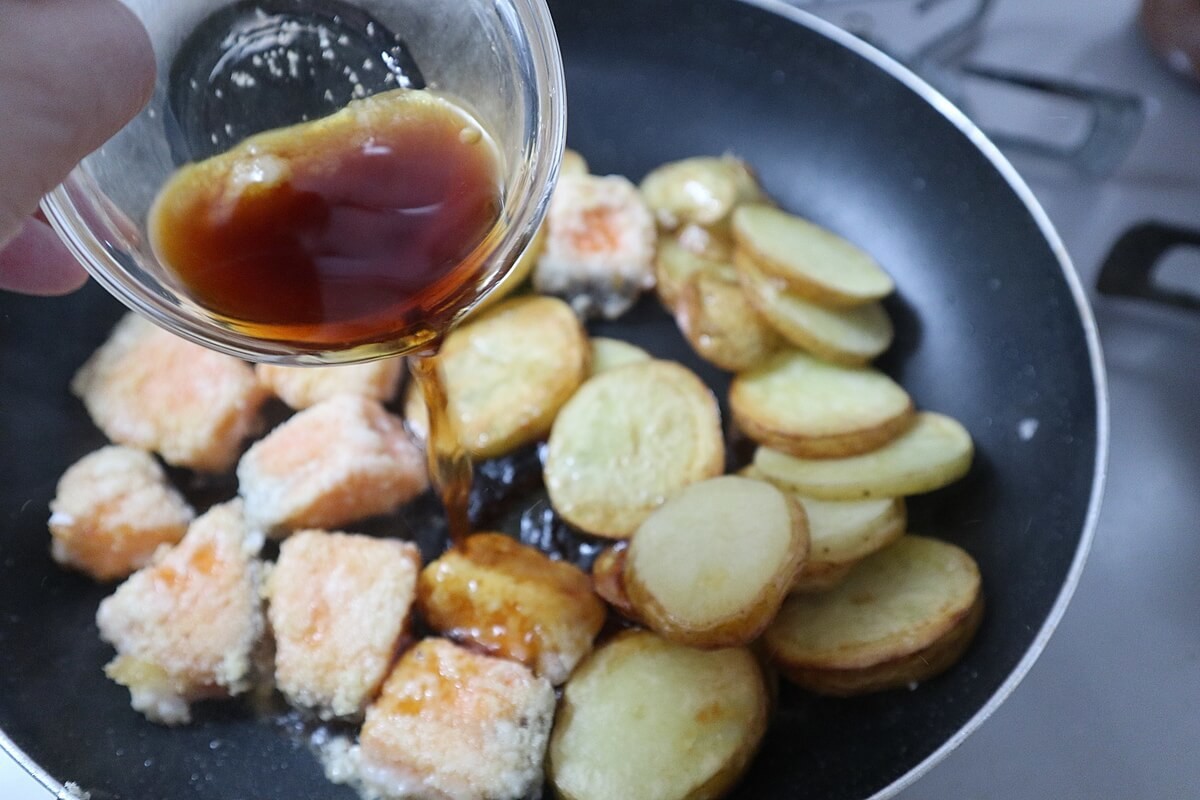 2、片栗粉をまぶした鮭を入れ、両面こんがり焼く。じゃがいもを戻して、Aを加えて、絡める。