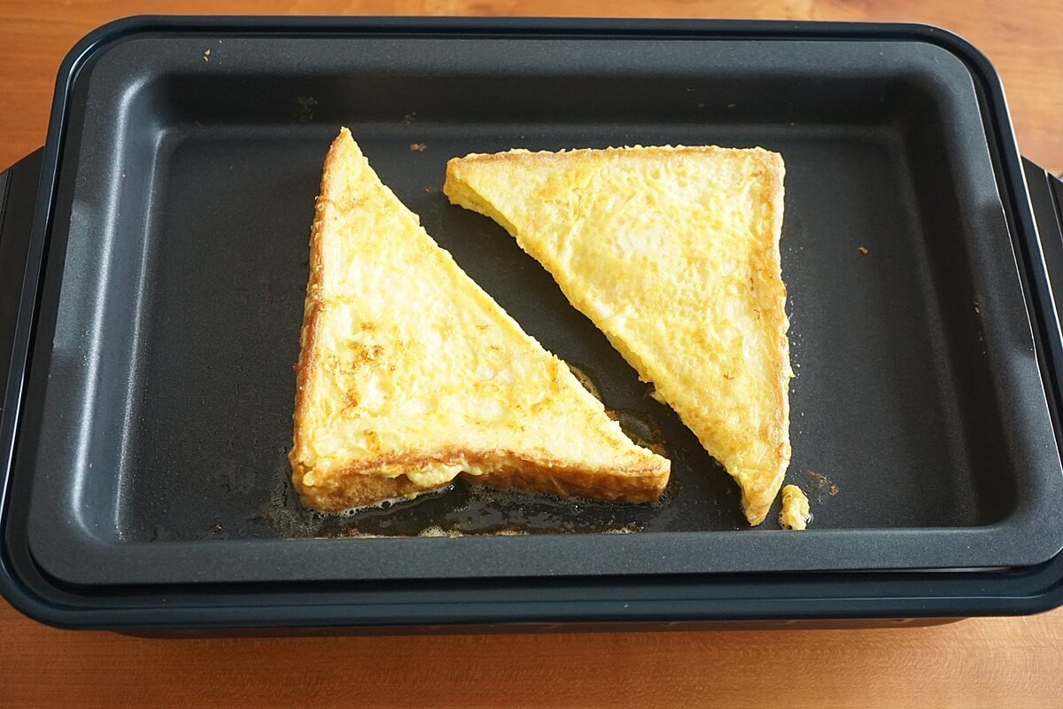 (4) バターが完全に溶けたら卵液に浸した食パンをホットプレートに入れます。