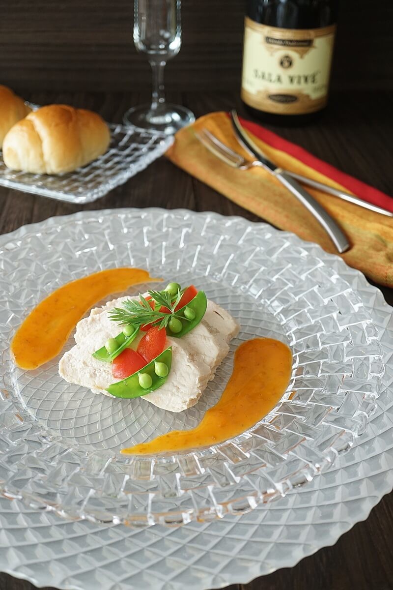カットした蒸し鶏に野菜を添え、その周りにパスタソースをかけました。