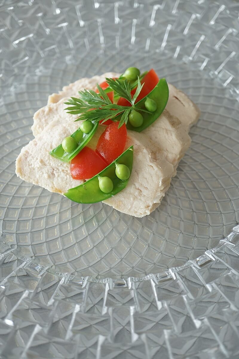 (8) 蒸し鶏の上にスナップエンドウとミニトマトをちらします。