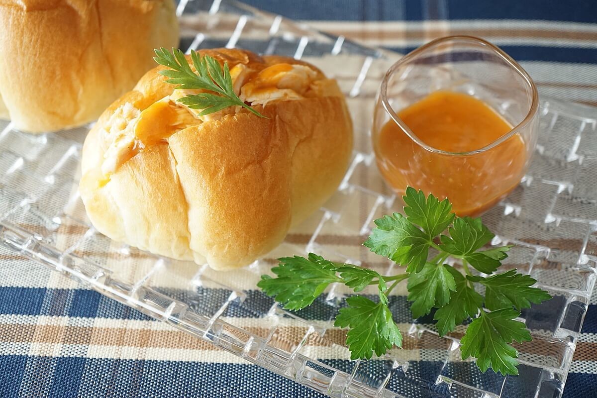 パンにはさんで「蒸し鶏のかにトマトクリームサンドウィッチ」の出来上がりです。