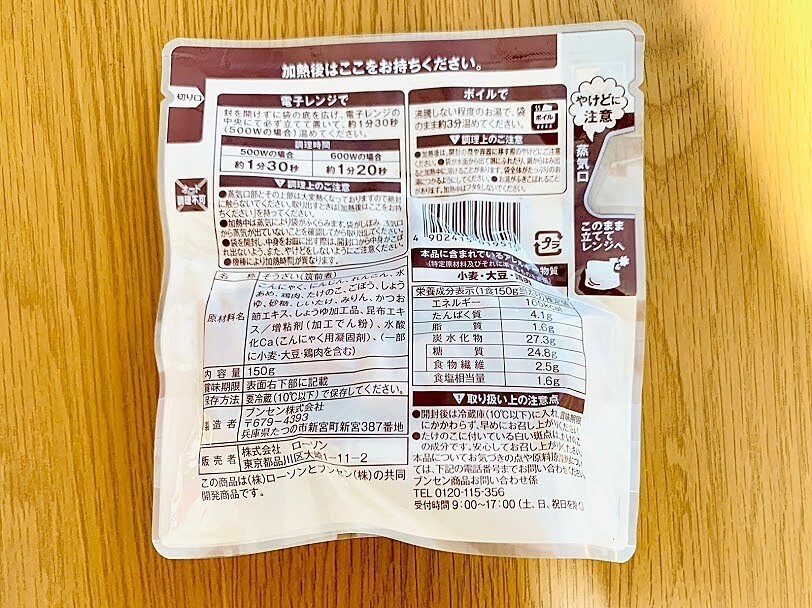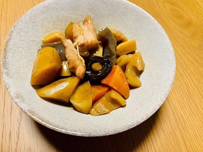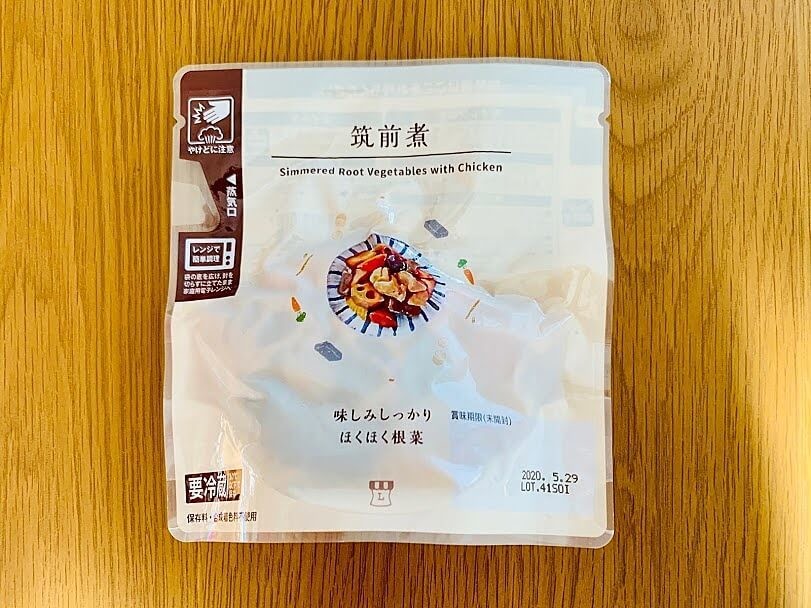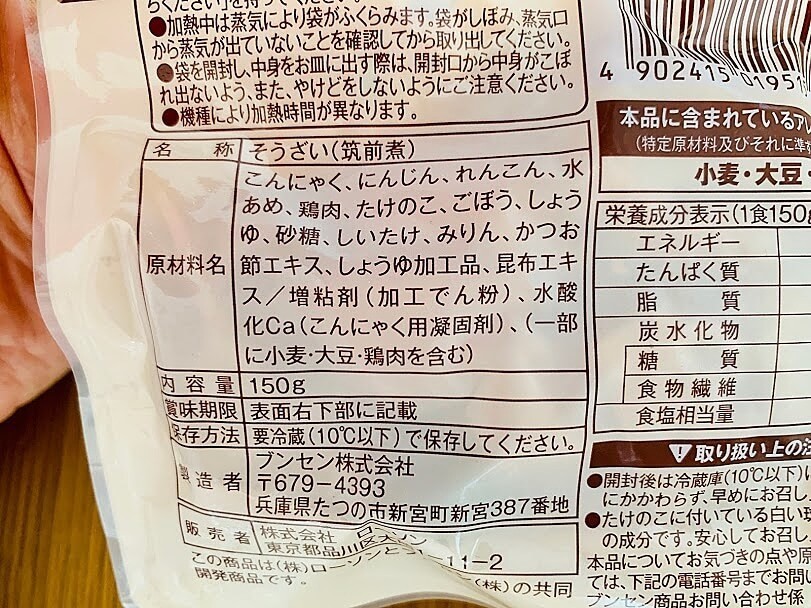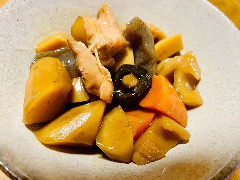 具材を見てみると、『こんにゃく・にんじん・れんこん・鶏肉・たけのこ・ごぼう・しいたけ』。7種類も入っています。皮をむいたり煮込んだりするのに時間がかかる根菜類の代表選手たちが集結。