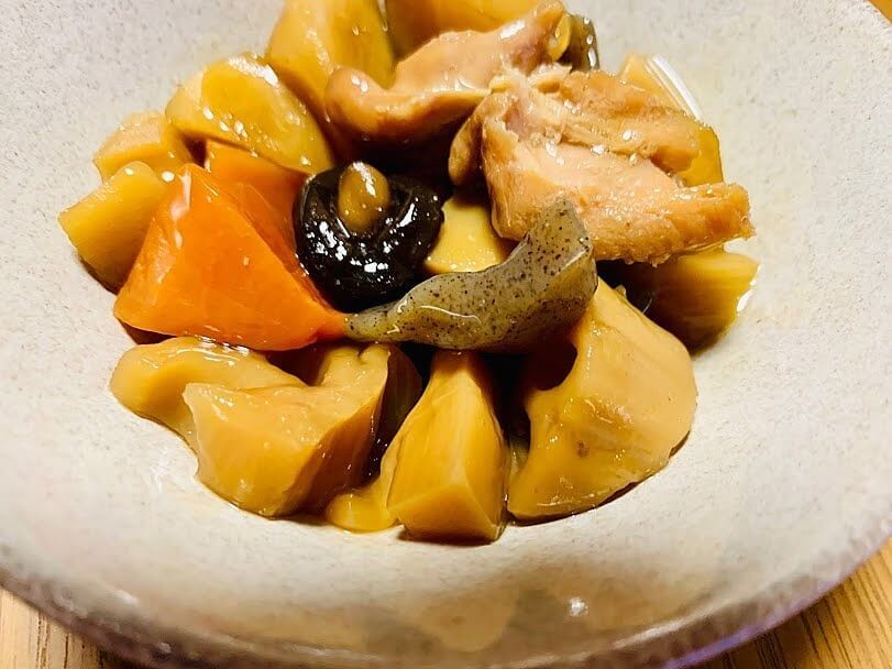 具材を数えてみると、こんにゃく4つ、にんじん3つ、れんこん3つ、鶏肉1つ、たけのこ3つ、ごぼう4つ、しいたけ1つずつ入っていました。