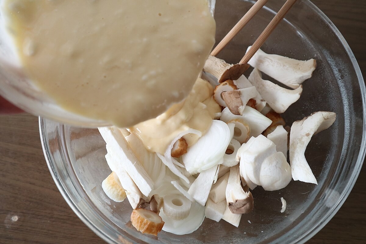 じつは、魚介を使わずとも、簡単に再現できるのです。秘密は、エリンギとちくわを具材にすること!意外にも、どことな~くイカの風味も感じる(笑)、 なんちゃって海鮮かきあげが作れます!